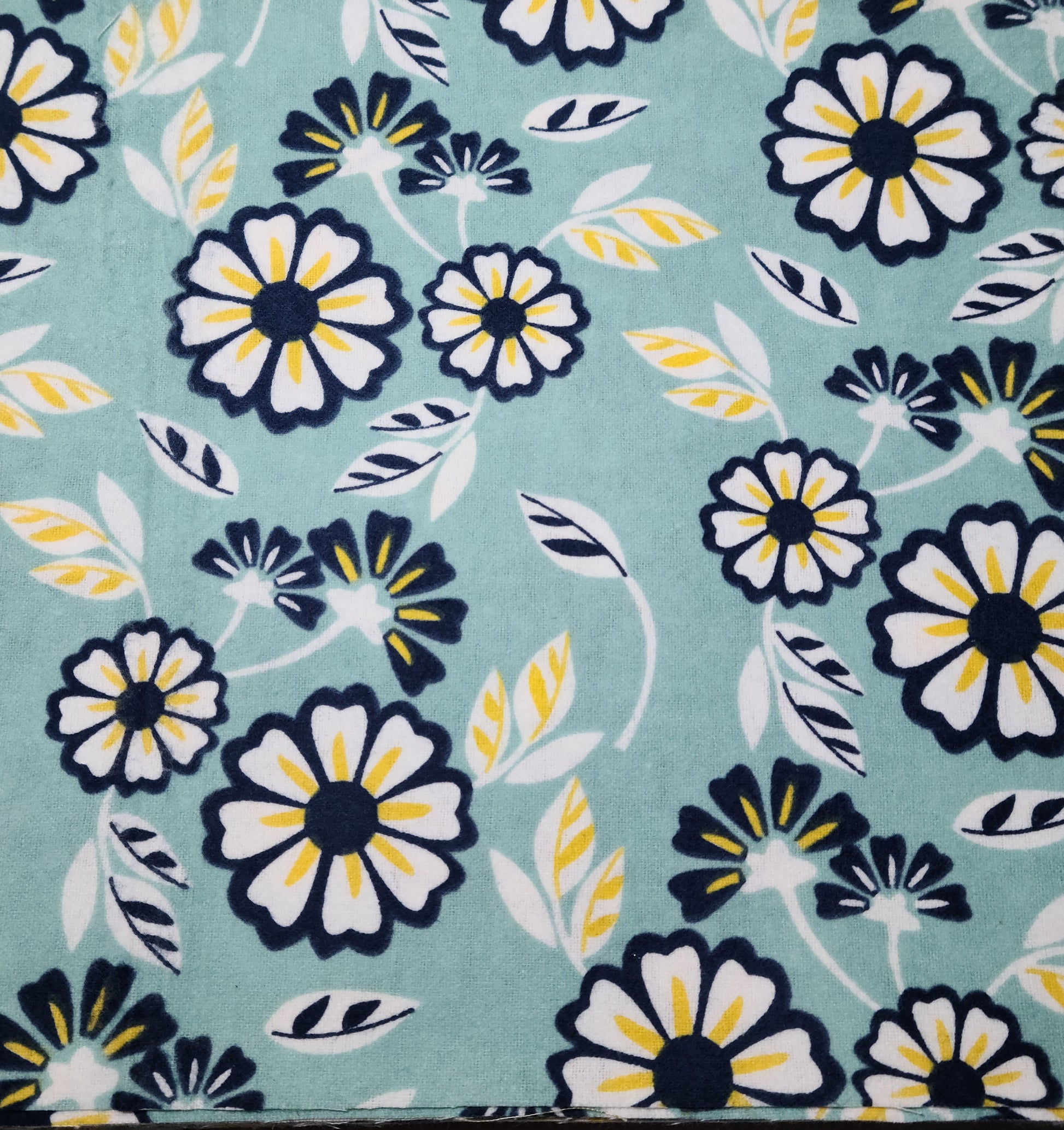 White flowers trimmed in dark blue with yellow accents on a seafoam green background.