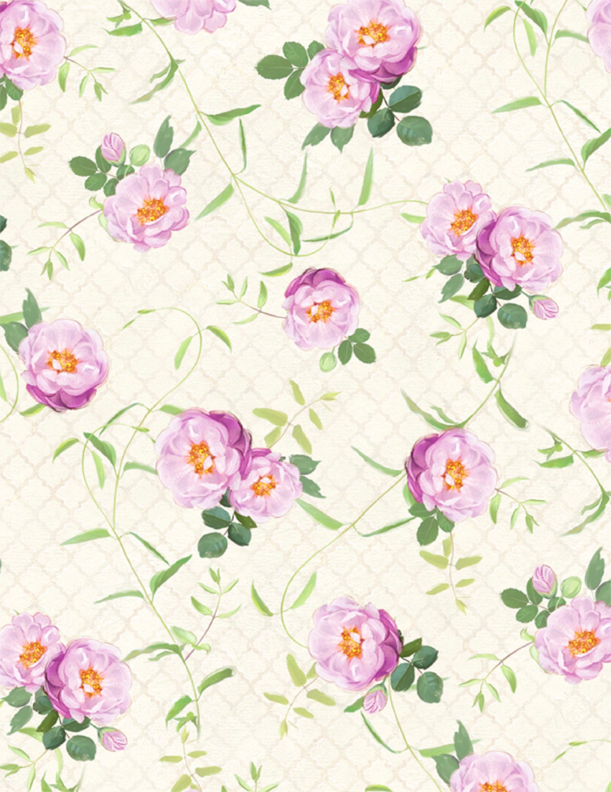 From the Flower Study Collection by Michael Davis for Wilmington Prints varying shades of pink rose vines accented with green on a cream background