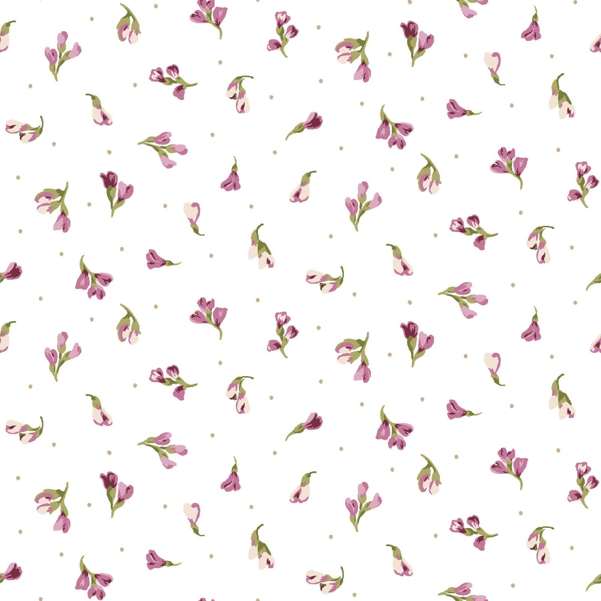 Beautiful floral quilt cotton featuring dainty flower buds of mauve and plum on a white background